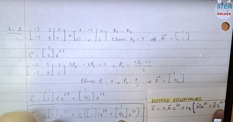 Jag förstår att man ska skriva den generella lösningen på formen nedan för systemet av differentiella ekvationen för repeated eigenvalues. Men varför ska man lägga till tex kt och P framför e^lambdat? Jag förstår att k och P är ett par nya egenvektorer till den andra, men jag undrar bara var detta kommer ifrån? Den första egenvektor med egenvärde har ju bara ett linjärt oberoende egenvektor med geometrisk multiplicitet 1 och algebraisk multiplictet två.