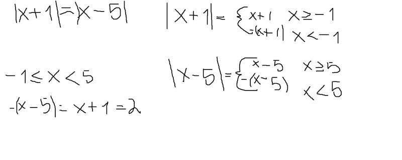 I varje av intervallen x<-1, -1 < x < 5och x > 5 får du en ekvation som du kan lösa (en del saknar lösnig). Om du ritar upp funktionerna y = |x+1| och y = |x-5| och ser efter var de korsar varandra får du ekvationens lösning(ar). Du kan också lösa de tre ekvationerna, som AlvinB föreslog, eller lösa det så som Albiki föreslog - det är kanske det enklaste sättet, om man har fattat vad absolutbelopp är.