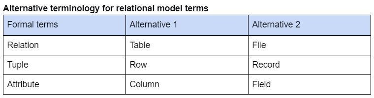 Jag har sett att tuple används i flera böcker om databaser. Här följer en tabell över termerna: