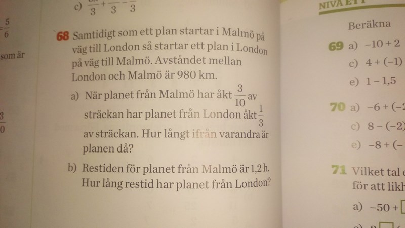 På b). Du kan börja med att räkna ut vilken hastighet planet från Malmö håller. Sedan tycker jag du ska försöka lista ut vad du kan få för hjälp av streckorna 294 och 327.