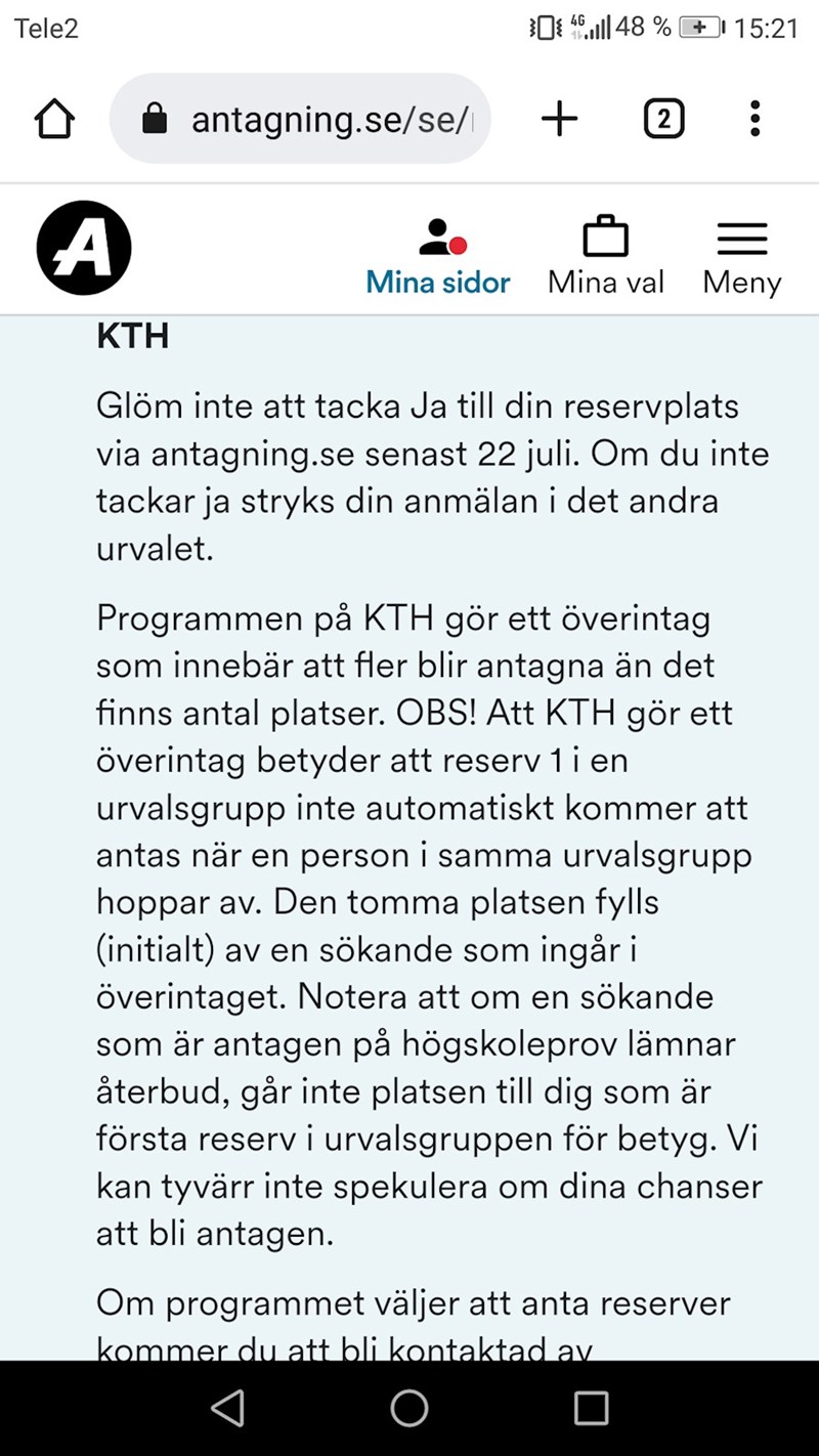 Ja precis. Nu läste jag även på Facebook av någon random professor /kth lärare som kommenterade i ett inlägg på en grupp att vissa program antas till o med inga reserver vilket fick mig o tänka på TF.