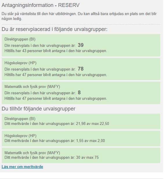 klonk skrev:Colegate skrev:Hondel skrev:Har för mig att i en tråd förra året kommenterades att Teknisk fysik på KTH (om det är vad du sökt) har ett överintag för att man räknar med att några tackar nej, och därför har de inte tagit in reserver på många år.