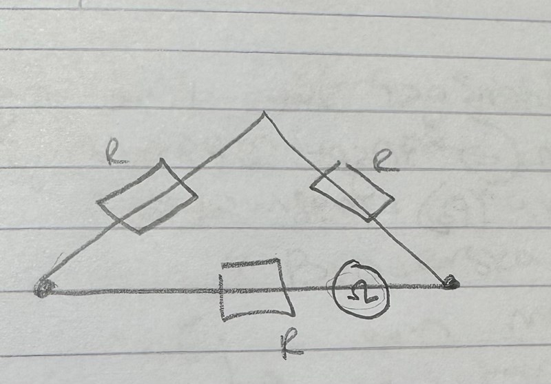 En ohmmeter mäter resistansen mellan de två pukter där den är inkopplad. I den här uppgiften är den inkopplad mellan två hörn. Det innebär att det är en resistor parallellkopplad med de båda andra resistorerna i serie. Det syns bättre om man ritar det så här: