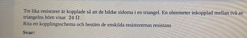 Smaragdalena skrev:En ohmmeter mäter resistansen mellan de två pukter där den är inkopplad. I den här uppgiften är den inkopplad mellan två hörn. Det innebär att det är en resistor parallellkopplad med de båda andra resistorerna i serie. Det syns bättre om man ritar det så här: