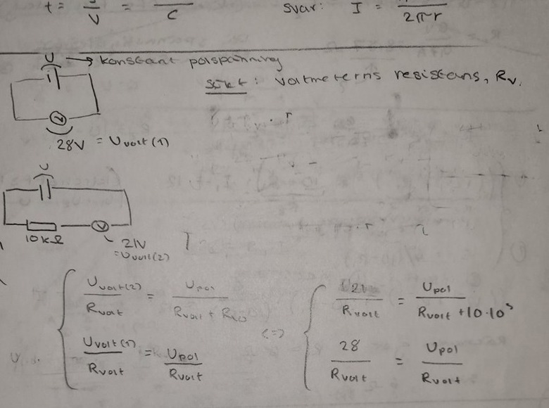 Voltmetern mäter spänningen över sitt inre motstånd, du kan rita kretsen som en spänningskälla till den är det kopplat två motstånd i serie, det första på 10 kOhm, det andra är okänt och det är över det vi mäter spänningen med Voltmetern