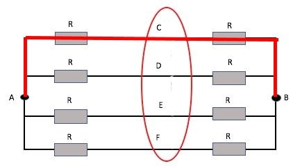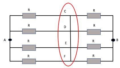 Det finns alltså inget som driver en ström mellan dessa fyra punkter. Om det ändå inte går någon ström kan vi klippa bort ledningarna mellan punkterna, så att A-B blir fyra parallella vägar, vardera med resistansen 2R.