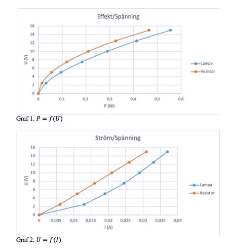Jag har i min laboration bestämt effektutveckling och resistans i två komponenter. Lampa och resistor. Mina grafer ser ut såhär.