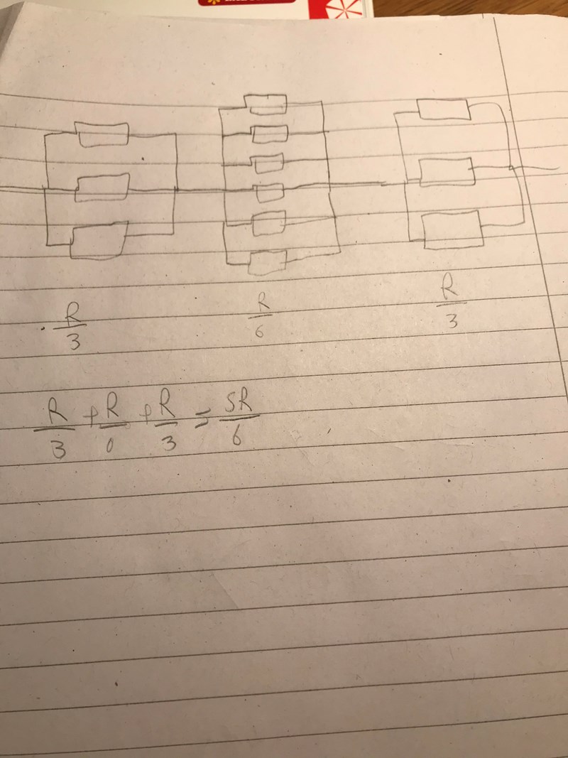 V = ⅓ I R + ⅙ I R + ⅓ I R = ⅚ R I = Rₑ I.
