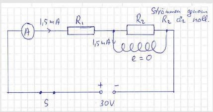 Till en spänningskälla med den konstanta polspänningen 30 V har seriekopplats en öppen strömställare, en amperemeter och två resistorer. Parallellt med en av resistorerna har anslutits en spole med försumbar resistans. När kretsen sluts visar amperemetern i första ögonblicket 1,0mA och 12v men utslaget ökar och stabiliseras efter hand på 1,5mA.