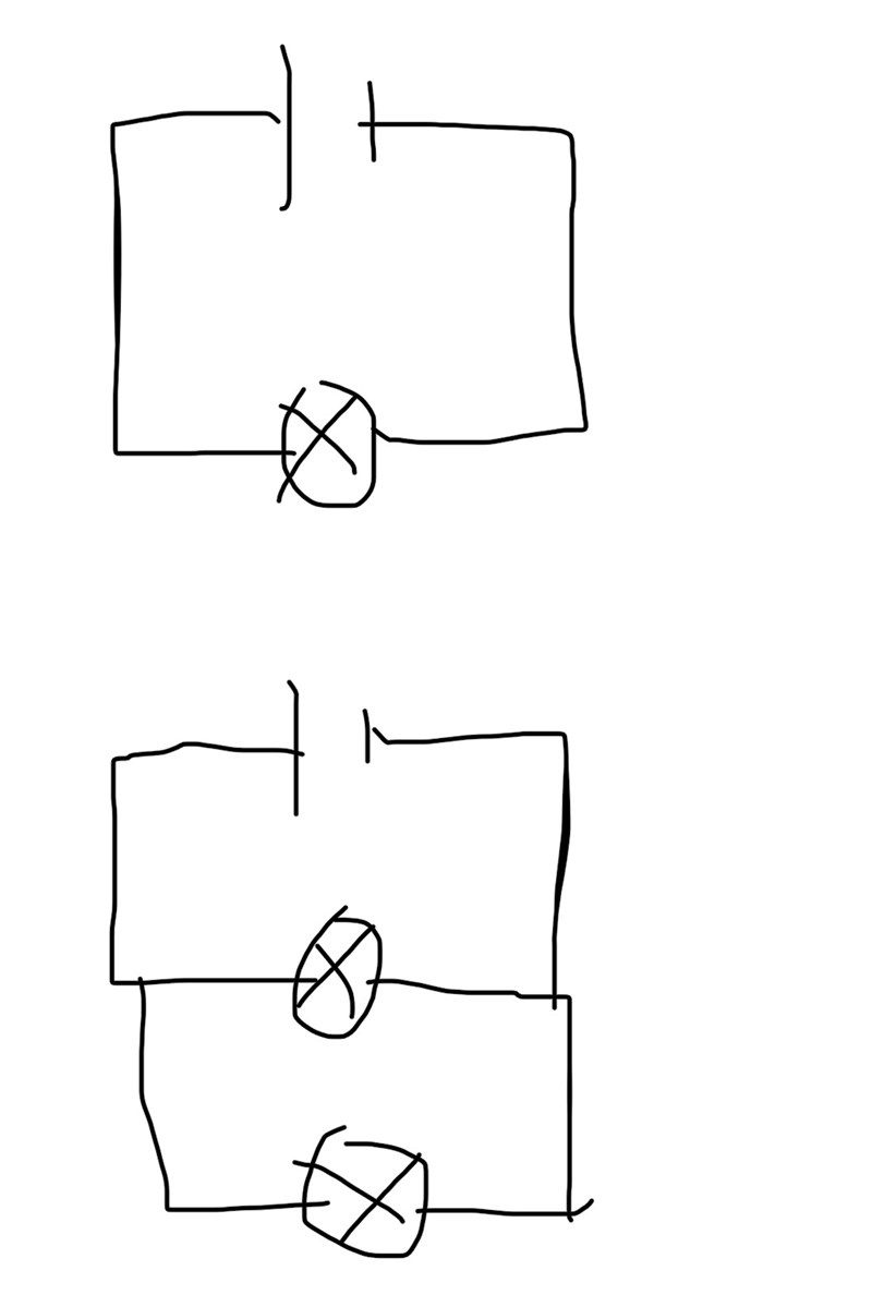 Tror du då, utan att räkna, att den första lampan kommer att lysa starkare om du kopplar in en till? Nej, det gör den förstås inte. Tillsammans ger dock två parallellkopplade lampor mer ljus än en enda.