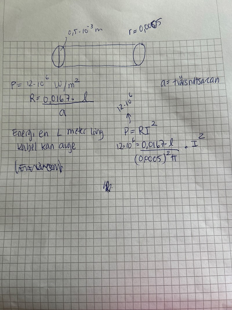 Sätt upp ett annat uttryck för vilken ström som behövs för att en L meter lång kabel ska avge den effekten