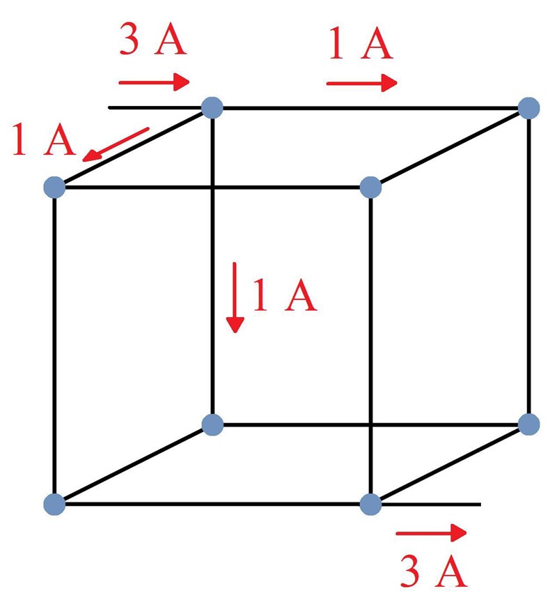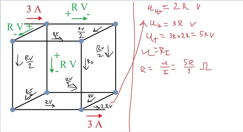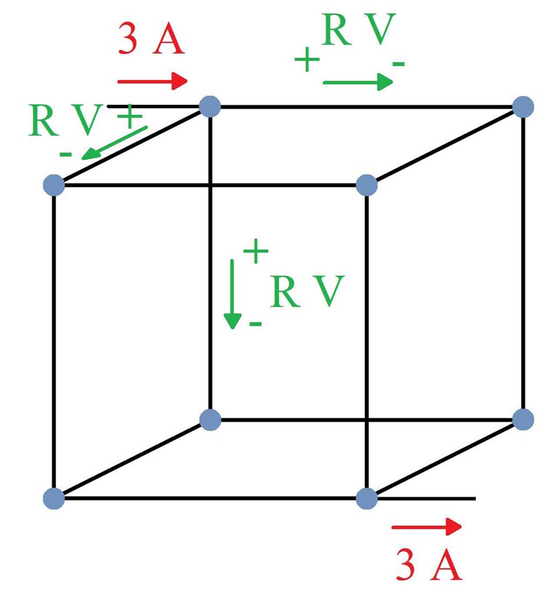Det kommer in en ström på 3 Ampere i ett av hörnen. Detta delas upp enligt Kirchoffs strömlag jämnt mellan varje av sidorna eftersom resistanserna i sidorna är lika. Vi får därmed 1 A av ström som flödar i sidorna enligt bilden. Detta resulterar i följande spänningsfall: