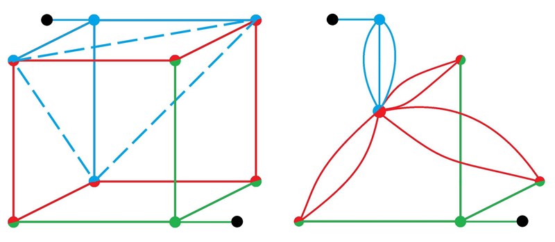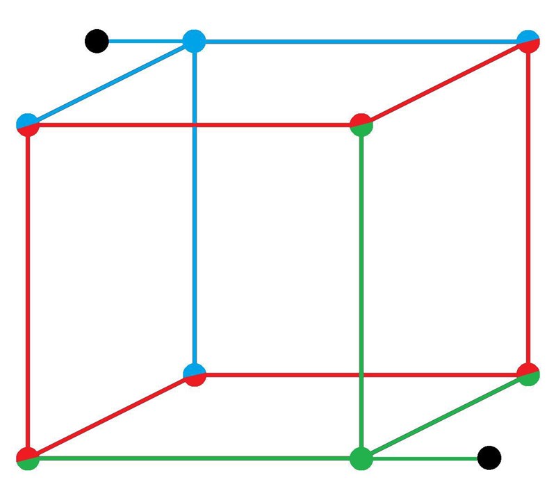 Om du tänker dig kuben på högkant så kommer de 6 resistorerna som är "närmast ekvatorn" att ha samma potential, så där kommer det inte att gå någon ström. Du kan alltså tänka dig att du plockar bort dem utan att några strömmar eller spänningar förändras.