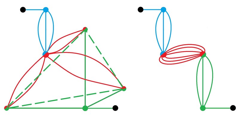 Likaså har de rödgröna samma potential (inte samma som de blåröda!) så vi kan kortsluta mellan dem: