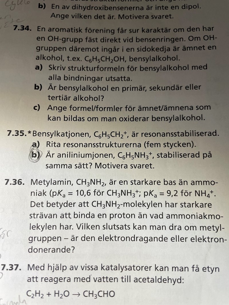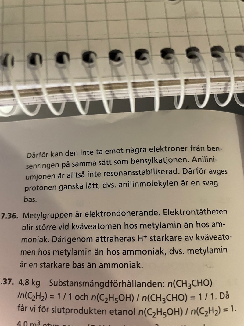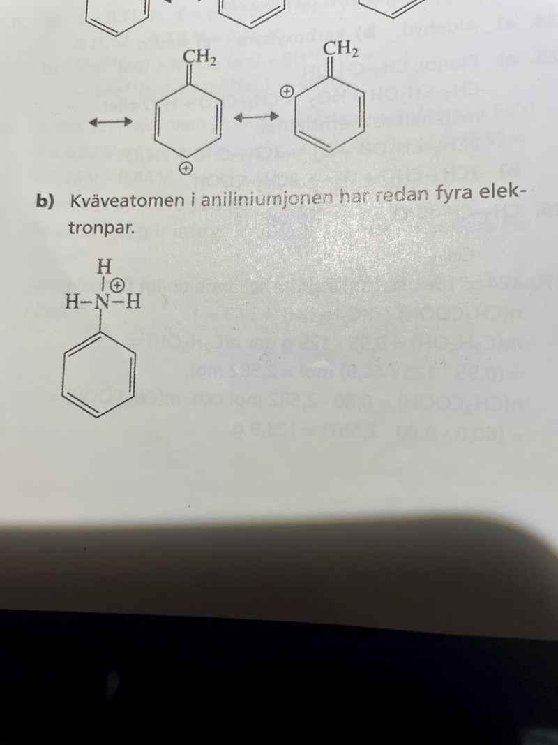 Uppgift 7.35b förstår jag inte. Det finns ju visst resonansstrukturer, kolla min figur. Elektronerna i dubbelbindningen kan visserligen inte hoppa över till enkelbindningen på kvävet och bilda dubbelbindning, men elektronerna kan ju istället hoppa runt i bensenringen, d.v.s elektronerna i bensenringen är delokaliserade. Men enligt facit så finns ingen resonansstruktur, vad menas???