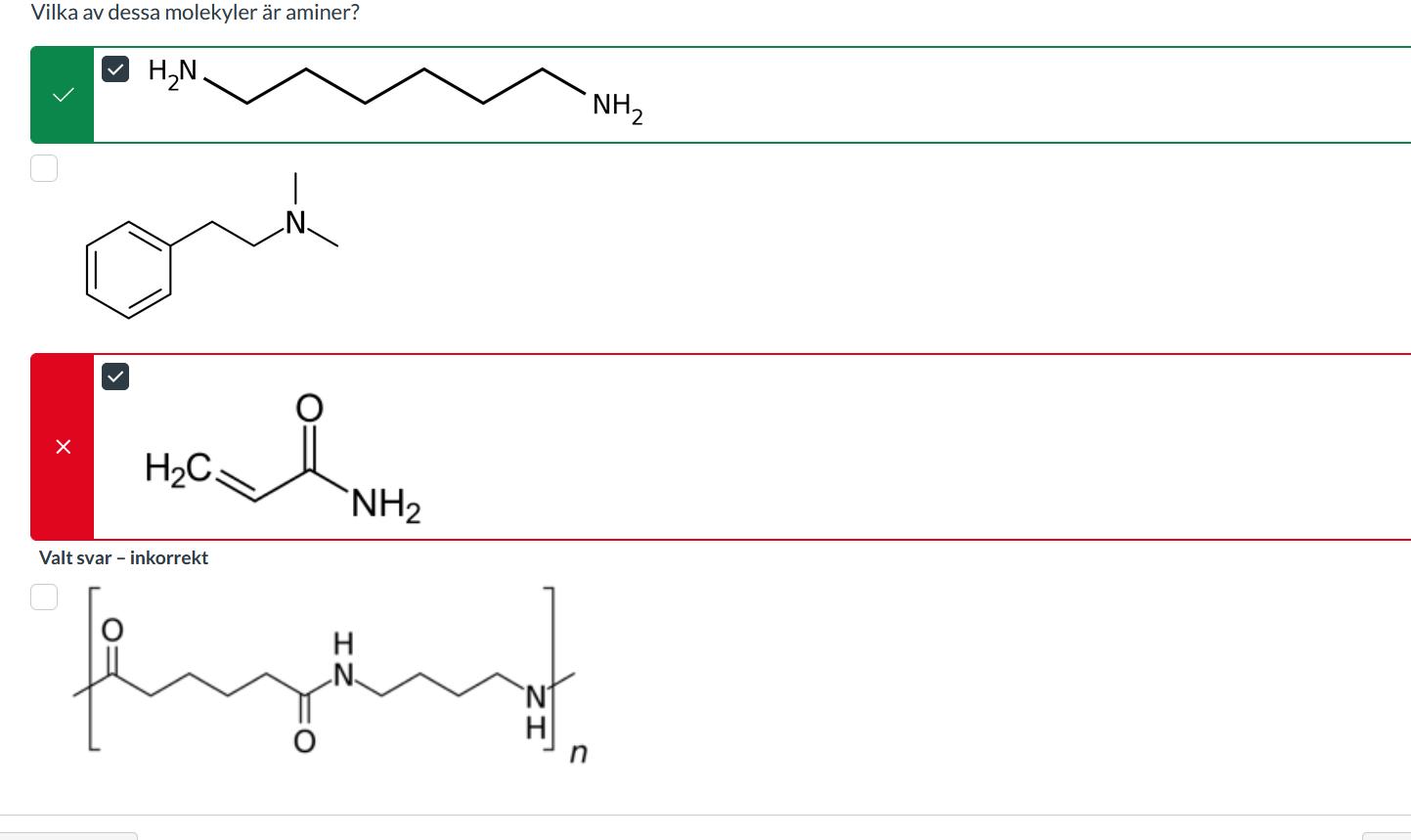 Hej! Jag skulle vilja fråga varför den tredje val är fel. Aminernas fuktionell grupp är R1-NH2 och är tänkte att 3) var rätt.