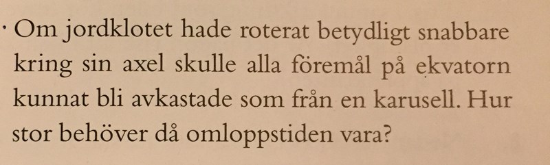 Leonhart skrev:Peter skrev:I din fråga 2 - ja det är fel att säga att föremålet är i vila. Det är just accelerationen som du vill studera. Den som, i princip, ges av högerledet. I "vanliga" uppgifter ignorerar man att jordytan är ett accelererande system för att det inte spelar någon roll för lösningen av de problemen. Så är det inte här, eftersom hela frågan handlar om jordrotation och acceleration.