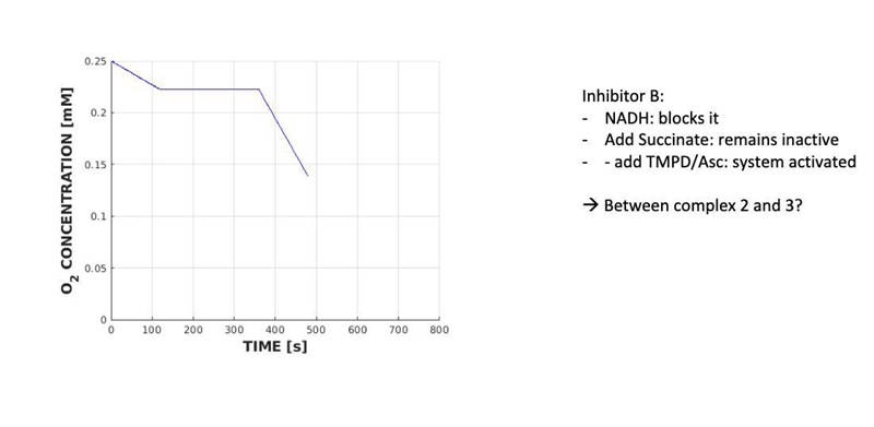 Syreförbrukningen startade med tillsatsen av NADH, men avstannade vid tillsatsen av inhibitorn B - så då kan antingen komplex I vara inhiberat (kan inte förbruka NADH och skicka elektroner vidare) eller så är det någon annan del som är inhiberat.
