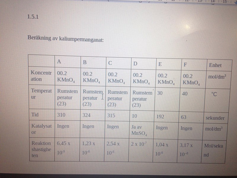 Men vi i klassen skulle endast räkna ut reaktionshastigheten av kaliumpermangenat , vi ska inte räkna ut något annat.Det där du säger om reaktionskärlet skulle bara nämnas vid utförandet vilket jag gjort fast har inte skickat det till dig.