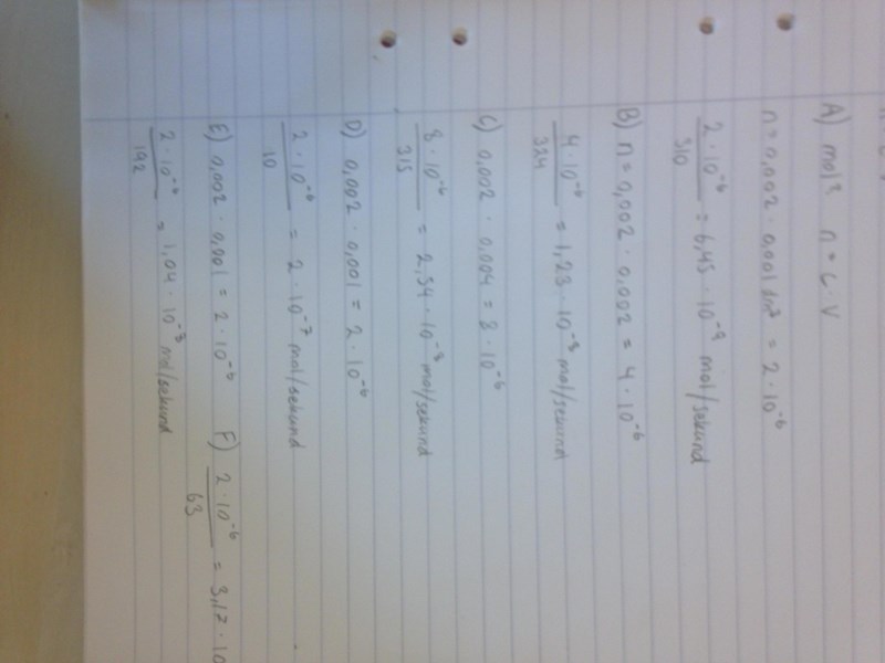 koncentrationen är 0.002 och volymen var det jag nämnde ovan , vi multiplicerade dessa och fick mol , därefter tog vi antalet mol vi fick på varje provrör delat på tiden det tog för provrören att visa vit färg , bam så fick vi reaktionshastigheten uttryckt som mol per sekund!