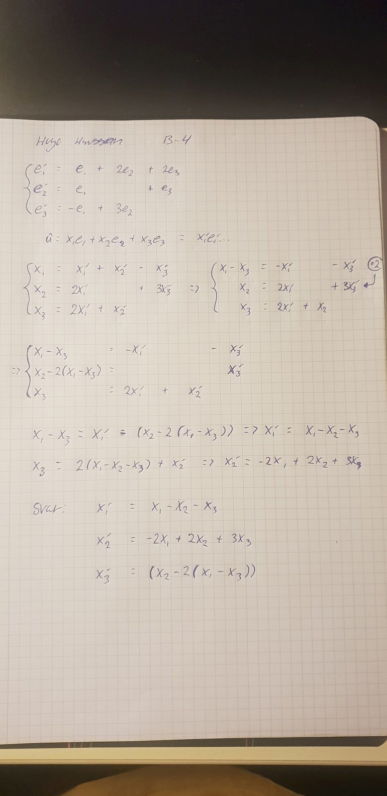 Uppgiften: Uttryck de nya koordinaterna x′1,x′2,x′3 i de gamla koordinaterna x1,x2,x3