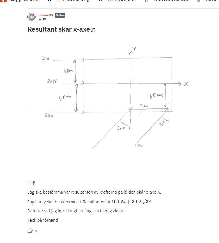 Jag skulle behöva ha hjälp med hur man ska tänka när man ska bestämma x-koordinaten för en resultant av flera krafter som skär x-axeln