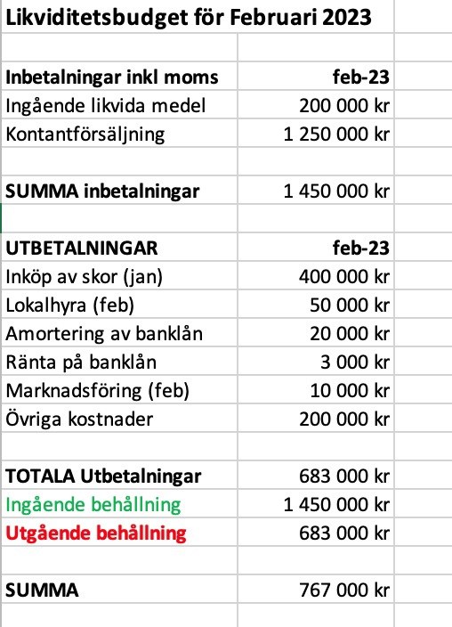 Ingående likvida medel i februari budgeteras till 200 000 kronor.