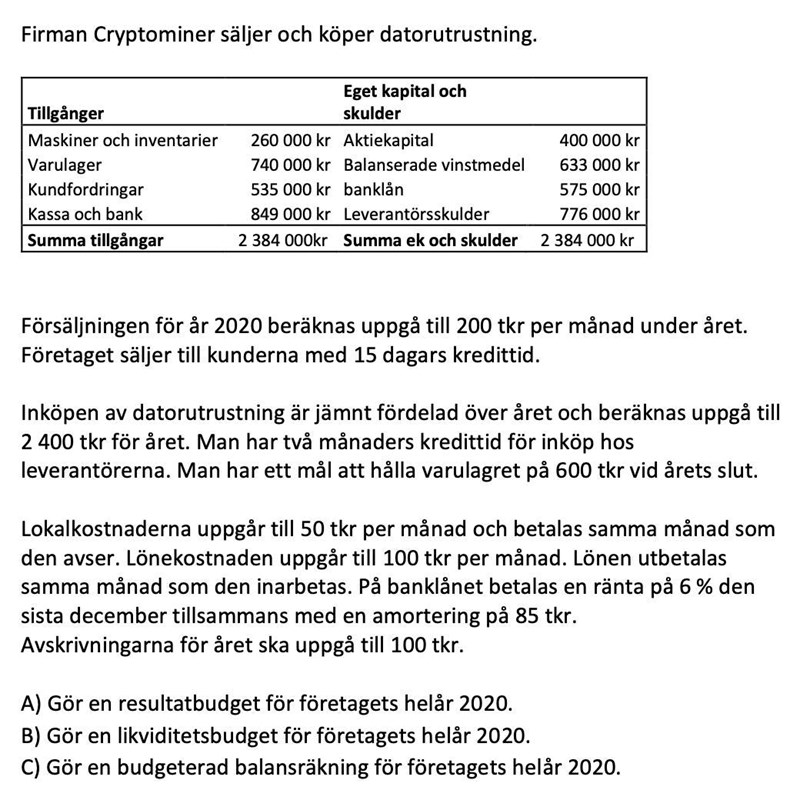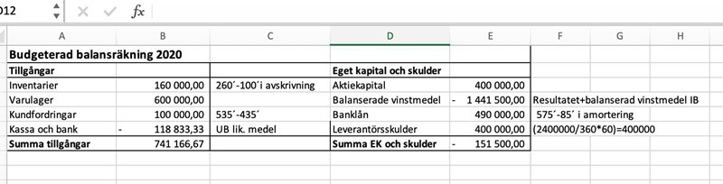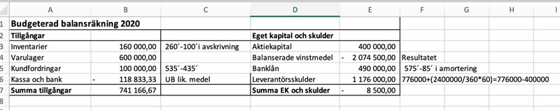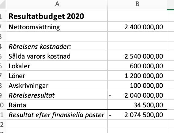 Jag tror jag har snurrat till det i resultatbudgeten. Troligen på kostnad för sålda varor där jag har läst till mig att man ska ta inköp+IB? Sedan antar jag att verksamheten får ett negativt resultat då försäljningen är lika stor som varuinköp? Samt, amortering dras samma dag som ränta. Då räknar jag väl först bort amorteringen från banklånet innan jag räknar räntan på 6%? Min lösning nedan: