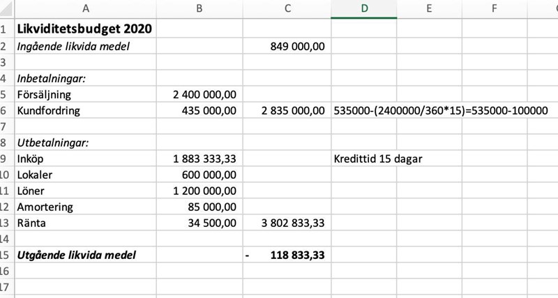 Sedan för likvida budgeten börjar jag med IB från kassan. För likvida budgeten är jag osäker på om jag ska addera försäljning med kundfordran uppgår till 2 935 tkr isåfall då jag under året kommer få in kundfordringarna på 535 tkr. Och eftersom verksamheten köper varor med 15 dagars kredittid behöver verksamheten inte betala denna del, så man drar bort denna från inköp? Alltså 2 400 - (2 400/360*15 ). Frågan är om jag missat något som ska vara med i budgeten.