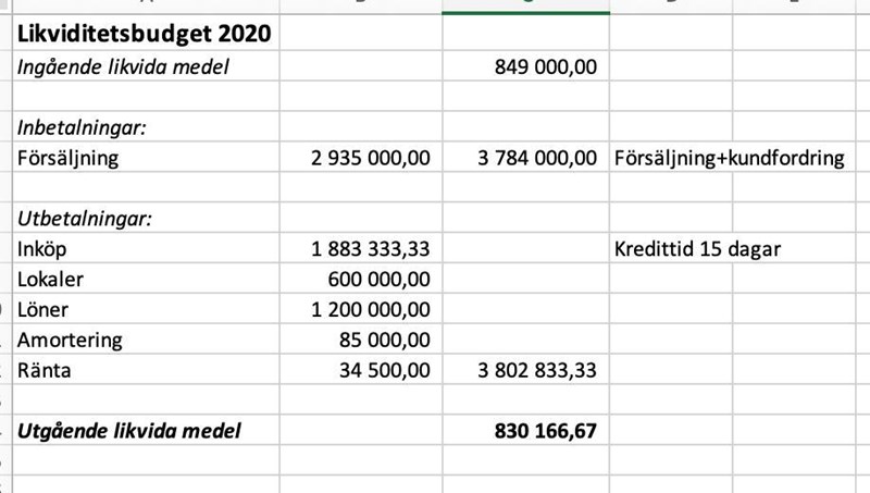 Jag förtydligade inbetalningar genom att dela upp försäljning och KF. Skrev även med uträkning för KF dvs. jag tog bort kvarstående KF från UB (100 tkr). Sedan tog jag IB likvida medel (849´) + Inbetalningar (2 835´) - Utbetalningar (ca3800´) = UB likvida medel. På uträkningen ovan för den tidigare likvidbudgeten hade jag tagit IB + (inbetalningar+IB) - utbetalningar för att få fram UB. Jag måste väl ha räknat IB en gång för mycket innan tänker jag?
