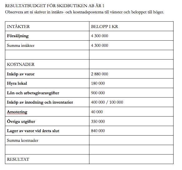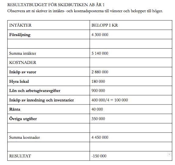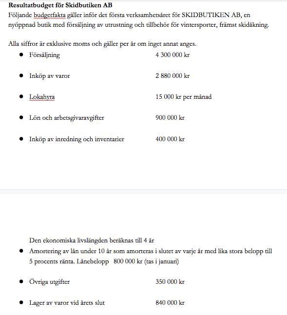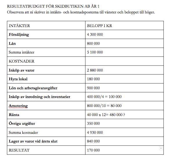 Arktos borde funderar över uppgiftens "andemening", som är att identifiera intäkts- och kostnads-poster från givna budgetfakta, inte att definiera poster med nya benämningar som "kostnad för sålda varor".
