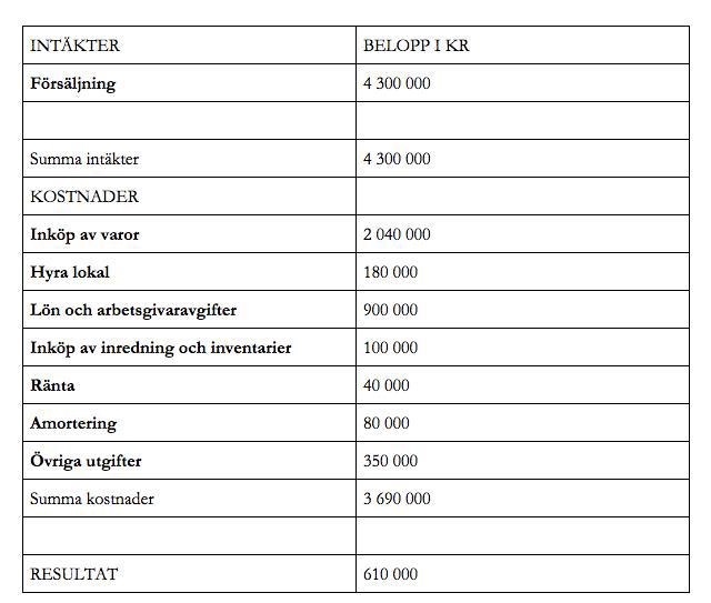 Nu har jag ändrat mer, tagit bort priset på varorna jag har kvar i lager i slutet av året på kostnaden av inköpet samt lagt till räntan och amorteringen. Tror detta är rätt så jag får tacka alla som har hjälpt mig att komma fram till detta svar.