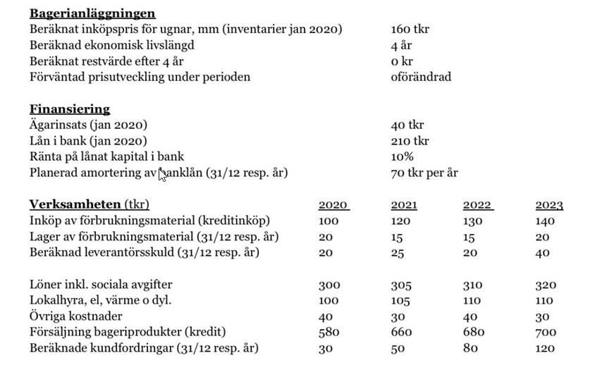 Jag håller på med en uppgift som består i att skapa resultat, likviditets och balansbudget för nedan bageri i fyra år.
