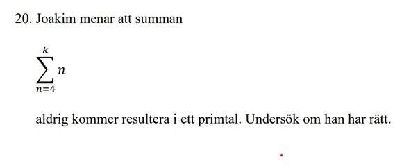 Hur som helst, bara att det består av två faktorer betyder inte direkt att det inte är primtal. En av faktorerna kan vara . Vidare, divisionen med ger att man behöver göra lite mer jobb (en av talen på toppen kan möjligtvis vara ) för att komma fram till om summan kan bli ett primtal eller ej.