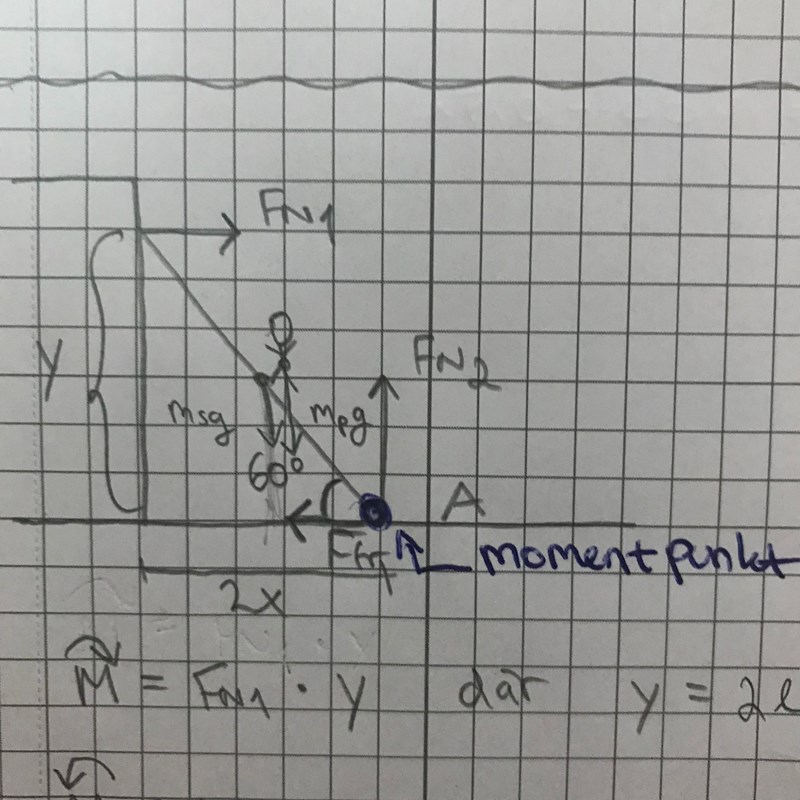 Jag har då försökt att lösa uppgiften och tänkte då att jag skulle använda mig av kraftmoment. Men det första jag gjorde var att rita ut alla verkande krafter och då fick jag: