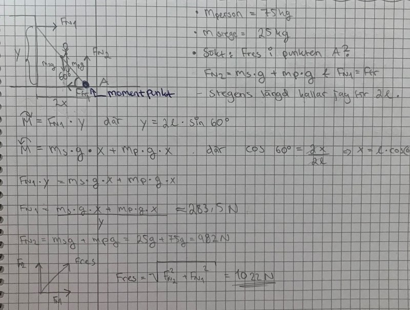 En stege står lutad mot en husvägg. Det finns ingen friktionskraft mellan husväggen och stegen. Mitt på stegen står en person som väger 75kg och stegen väger 25kg. Vi vet också en vinkel på mellan marken och stegen (se figur). Man vill veta hur stor den resulterande kraften är vid punkten A (se figur).