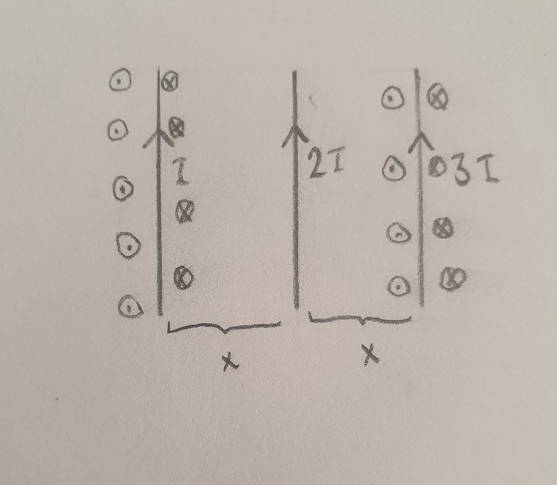 Eftersom F=BIL och B=K×I÷R så gissar jag på att kraften från ledaren med strömmen 3I är större. Och sedan med hjälp av högerhandsregeln får jag att riktningen är horisontell till höger om den mellersta ledaren.