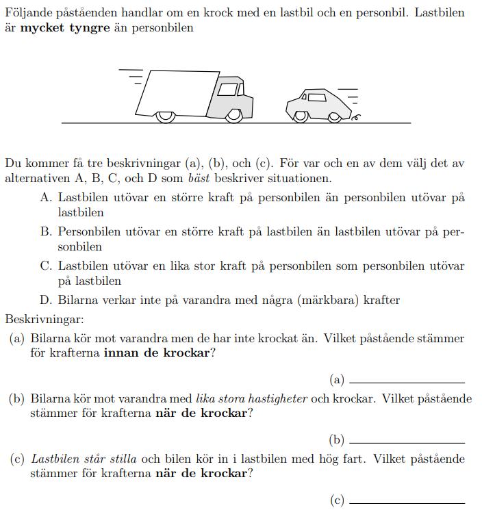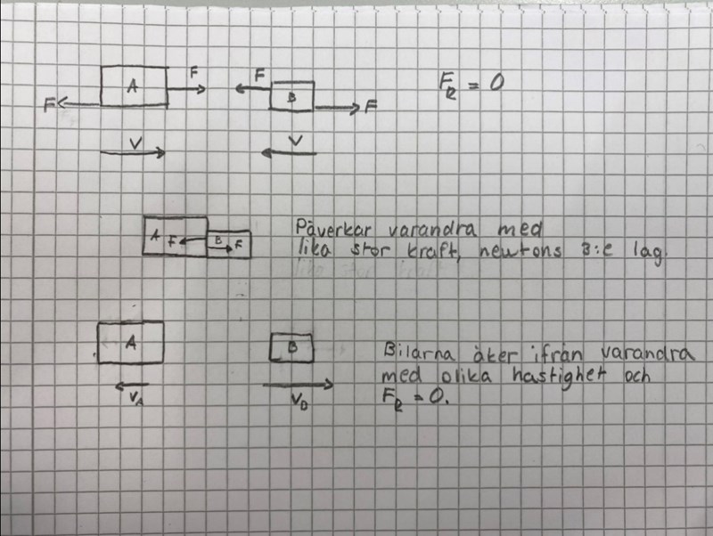 b och c) Jag känner mig fortfarande smått förvirrad, eftersom nu tänker jag att i oavsett hastighet eller massa så påverkar föremålen i en kollision varandra med samma kraft, är det alltid så?