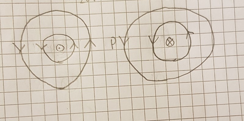Enligt högerhandsregeln borde den vänstra ledaren ha ett magnetfält som spinner medsols, och den högra motsols.