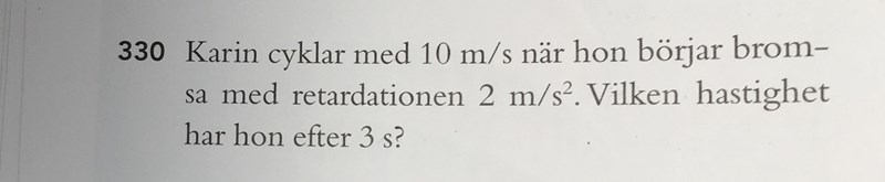 Hennes hastighet var 10 m/s från början. Vilken var hennes hastighet när hon hade bromsat i 3 sekunder?