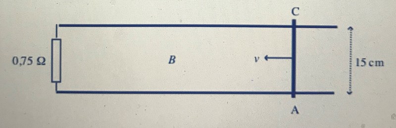Ett homogent magnetfält B = 1,5 T är riktat ut från papperet enligt figuren nedan. Två långa parallella ledare (som kan betraktas som resistansfria) är utplacerade vinkelrätt mot fältet. Avståndet mellan ledarna är 15 cm. I serie med dessa ledare finns en resistor med resistansen 0,75. En kraftig metallstång AC med massan 2,5 kg placeras vinkelrätt mot ledarna och i god kontakt med dessa. Man skjuter iväg stången med begynnelsehastigheten v = 6,0 m/s åt vänster i figuren. Friktionskraften mot ledarna är 4,5% av stångens tyngd. Figuren ses uppifrån.