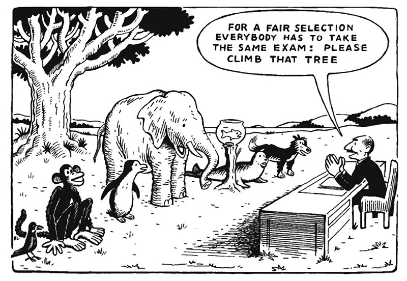 Jag tänker att argumentet om att vissa elever har fallenheter, talanger, olika förutsättningar för praktiska ämnen så skulle man kunna använda liknelser, hyperboler eller dylikt. Här är ett exempel att lite inspireras av som rör sig i samma härad