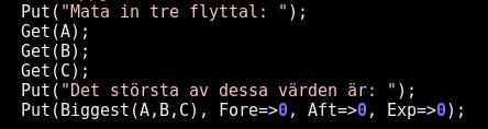 Hej, jag skriver ett underprogram som ska ta in 3 flyttal och returnera det största av dessa 3 tal.