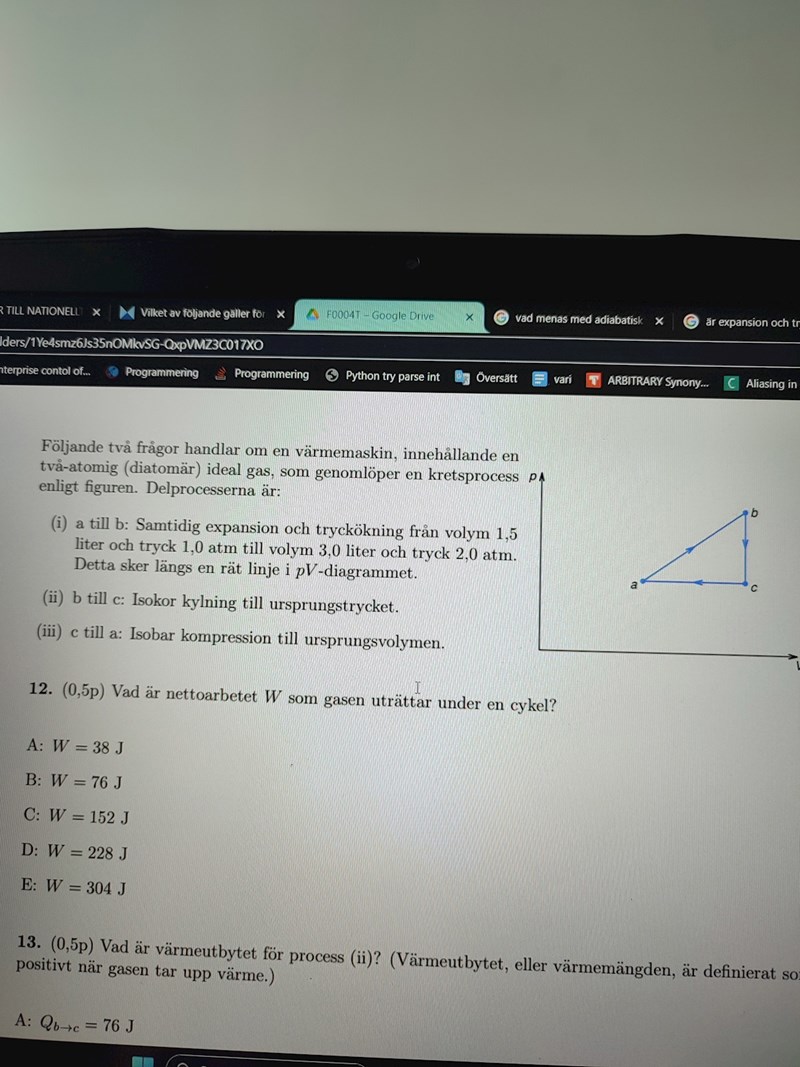 Hej! Jag försöker lösa denna fråga från en gammal tenta (fr.12) men vet inte hur jag ska tänka kring processen a->b? Kan man se det som en reversibel process? (Volymändringsarbete)? Och om man kan det så hur ska jag kunna använda den formeln? För trycket i a och b är ju olika?