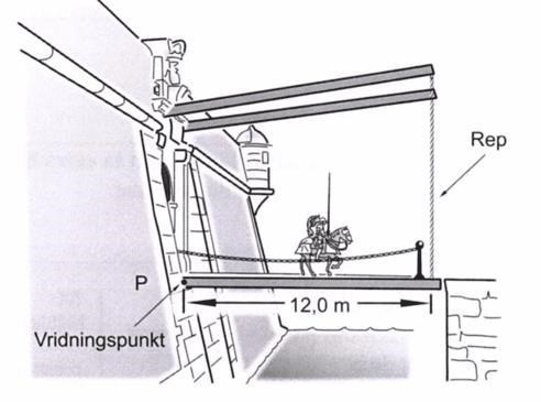 Sir Lancelot rider ut från sitt slott på den 12,0 m långa vindbryggan över vallgraven. Vindbryggan är vridbar kring punkten P. Han vet inte om att hans fiender har skadat repen som håller vindbryggan på plats så att dessa rep går av då den sammanlagda dragkraften i repen blir större än 6,2 kN.