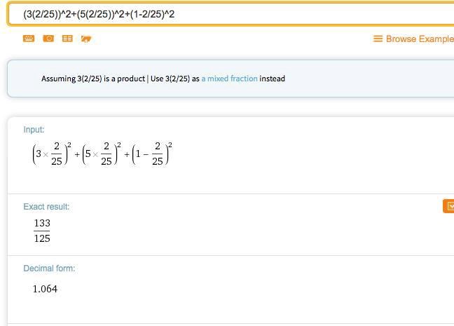 Jag får ut ett värde då ju, om jag tar exemplet: https://www.wolframalpha.com/input/?i=(3(2%2F25))%5E2%2B(5(2%2F25))%5E2%2B(1-2%2F25)%5E2