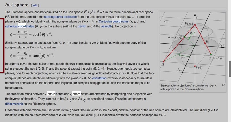 Där har du hursomhelst utvecklingen av resonemanget du förde ovan och resultatet det hade lett till längst ned på sidan. För varje komplext tal finns en motsvarande punkt på Riemannsfären genom stereografisk projektion. Punkten ifråga hittas genom att dra en linje från till "Nordpolen"; skärningspunkten med sfären blir då punkten P. Koordinaterna blir då: