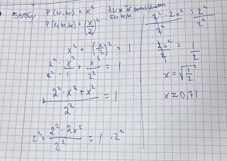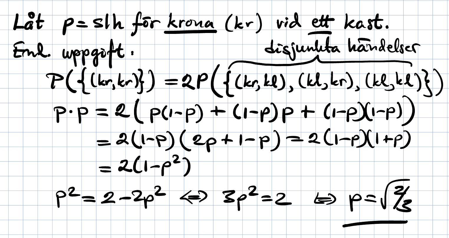 Uppgiften ger P(kr,kr)=2P(”något annat”), alltså: p2=2(1-p2).