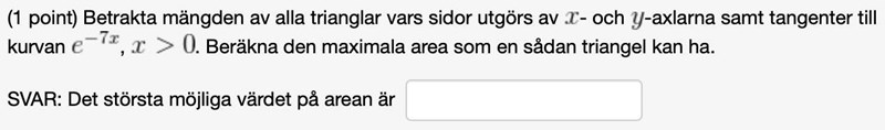 Får tangenten genom tangentens ekvation: y=k(x-a)+f(a). k=f'(a)=-7e^(-7a), och f(a)=e^(-7a). Vill räkna ut var den skär x-axeln och y-axeln. Börjar med x-axeln, -7e^(-7a)(x-a)+e^(-7a)=-7e^(-7a)(x-a-e^(-7a)/7). x=a+e^(-7a)/7 där kurvan skär x-axeln. Räknar nu ut var den skär y-axeln. y=-7e^(-7a)(0-a)+e^(-7a)=7ae^(-7a)+e^(-7a). Arean av triangeln blir x-värdet för skärningspunkten med x-axeln multiplicerat med y-värdet för skärningspunkten med y-axeln dividerat med 2. Alltså, A(a)=(7ae^(-7a)+e^(-7a))(a+e^(-7a)/7).
