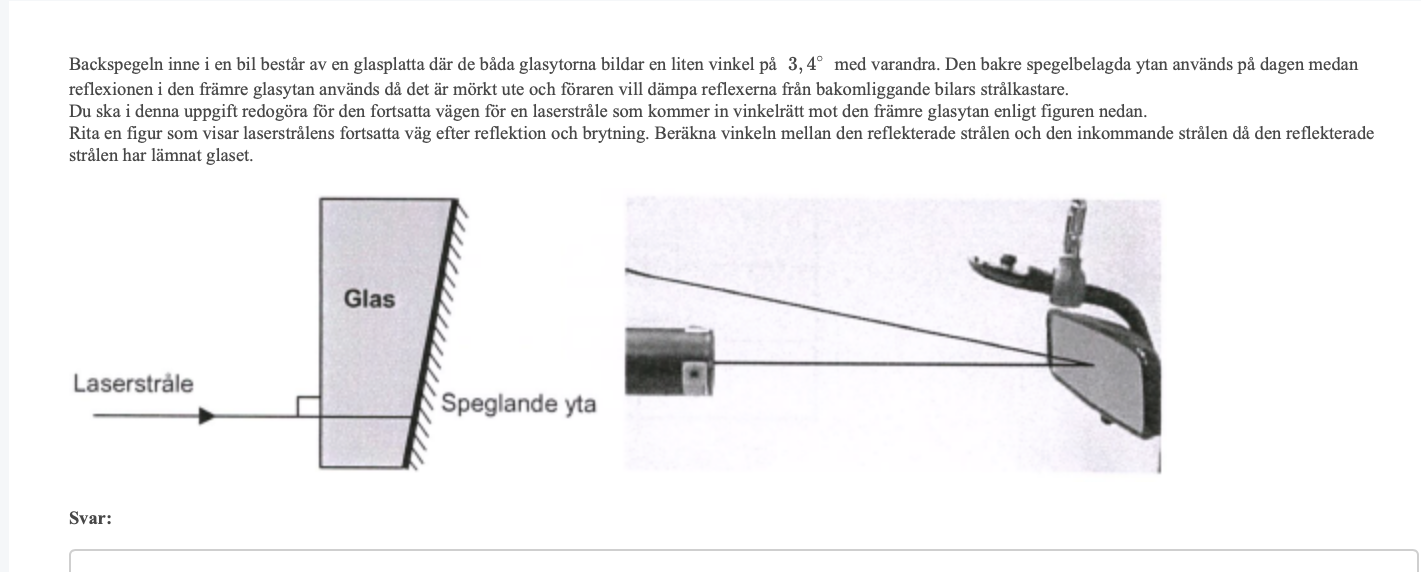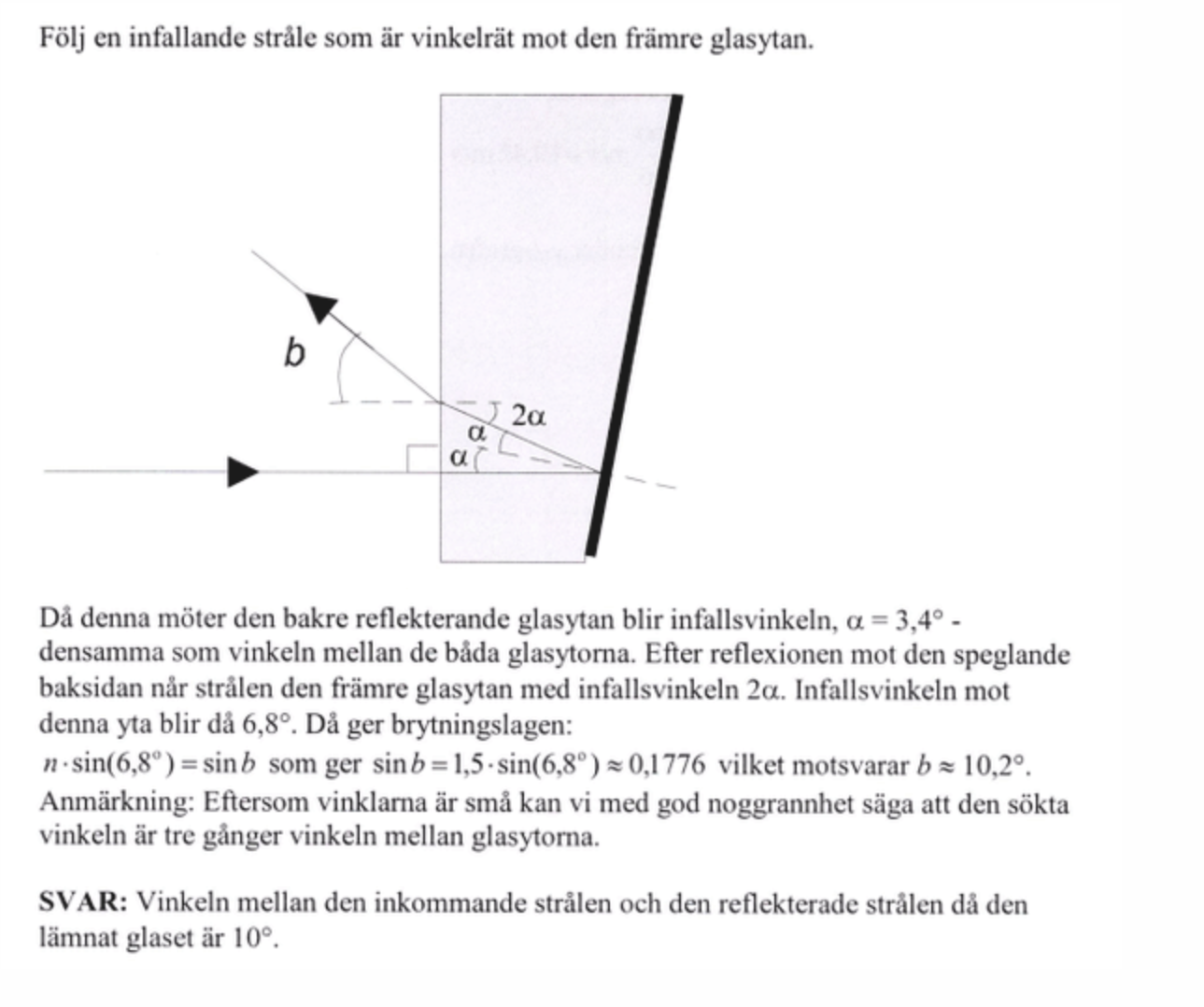 Tack! Men vinkelskillnaden? Strålen lämnar glaset med vinkeln 10,20 grader. Den ingående strålen färdas ju rakt vinkelrätt mot glasskivan?